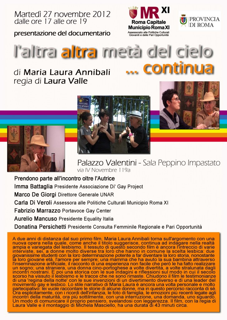 Martedì 27 novembre 2012, dalle ore 17 alle ore 19, presso Palazzo Valentini – Sala Peppino Impastato, via IV Novembre 119A, si svolgerà lapresentazione del documentario “L’altra altra metà del cielo… continua” diMaria Laura Annibali, per la regia di Laura Valle. A due anni di distanza dal suo primo film, Maria Laura Annibali torna sull’argomento con una nuova opera nella quale, come anche il titolo suggerisce, continua a indagare nella realtà ampia e variegata del lesbismo. Il tessuto di questo secondo film è ancora l’intreccio di varie interviste a donne molto diverse tra loro che hanno in comune la scelta lesbica. Prendono parte all’incontro oltre l’Autrice: Imma Battaglia Presidente Associazione Di’ Gay Project; Marco De Giorgi Direttore Generale UNAR; Carla Di Veroli Assessora alle Politiche Culturali Municipio Roma XI; Fabrizio Marrazzo Portavoce Gay Center; Aurelio Mancuso Presidente Equality Italia; Donatina Persichetti Presidente Consulta Femminile Regionale e Pari Opportunità. L’evento a cura delMunicipio Roma XI Assessorato alle Politiche Culturali, Giovanili e delle Pari Opportunità si svolge con il patrocinio della Provincia di Roma. Ingresso libero.