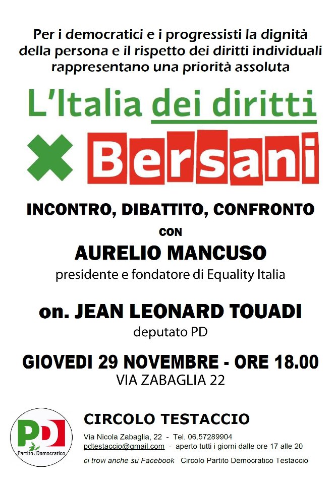 Sosteniamo Pierluigi Bersani alle Primarie del centro sinistra, perché lo riteniamo in grado di concretizzare le proposte su cui da molti anni siamo impegnate e impegnati. Nell’ottica di una Europa politica che salvi l’Europa economica chiediamo a Bersani di sostenere tutte le Risoluzioni, Direttive, Convenzioni internazionali ed europee a tutela di tutti i diritti umani e civili. (altro…)